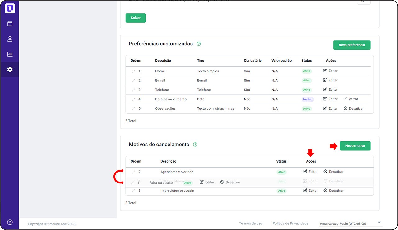 Este é o seu espaço para personalização. Você pode alterar a ordem dos motivos, basta arrastar as linhas nas setinhas de ordem, ou usar a opção ‘Editar’ para modificar os motivos existentes. Além disso, você pode criar novos motivos ou desativar os que já foram criados.