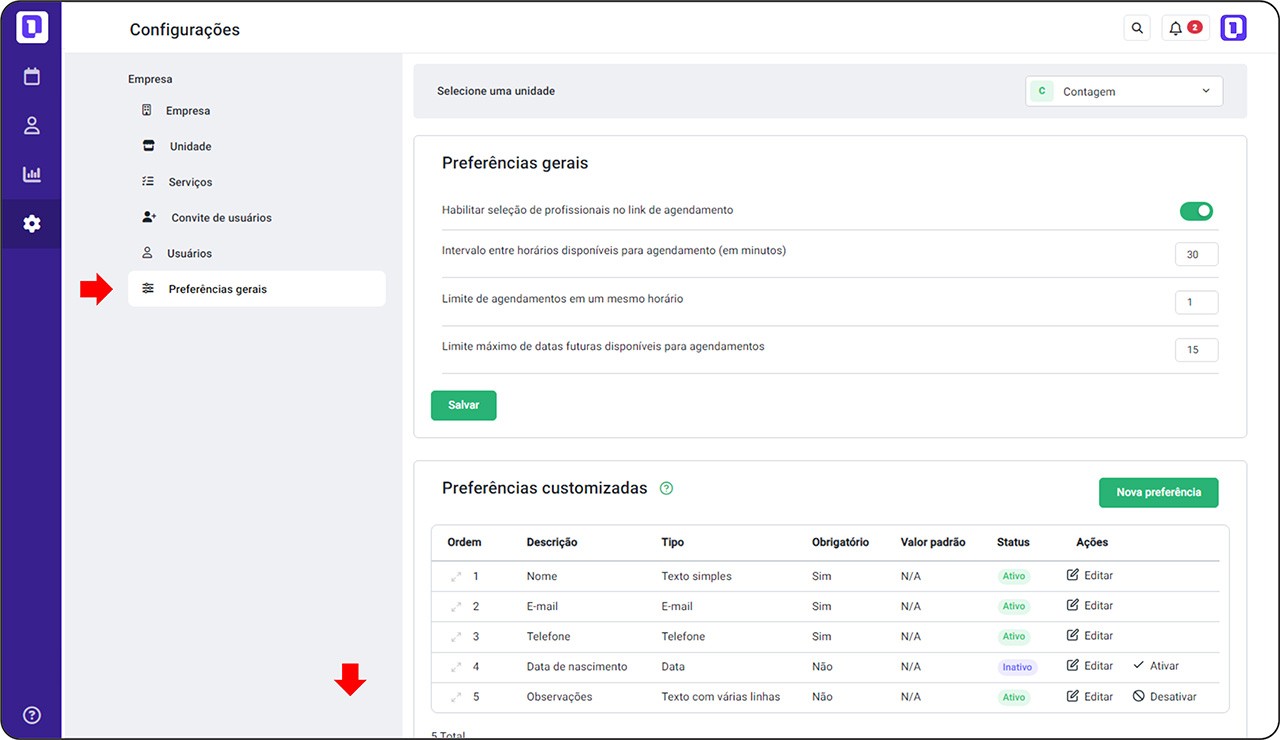 No menu lateral que se abrirá, selecione a última opção, ‘Preferências Gerais’, e role a página até o final para encontrar o campo de ‘Motivos de Cancelamento’.
