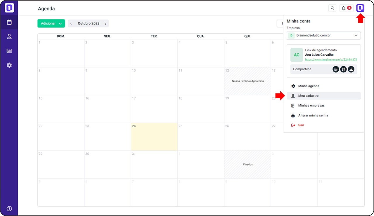 Para alterar sua senha, posicione o cursor do mouse sobre o ícone no canto superior esquerdo da tela e, em seguida, selecione ‘Meu Cadastro’.