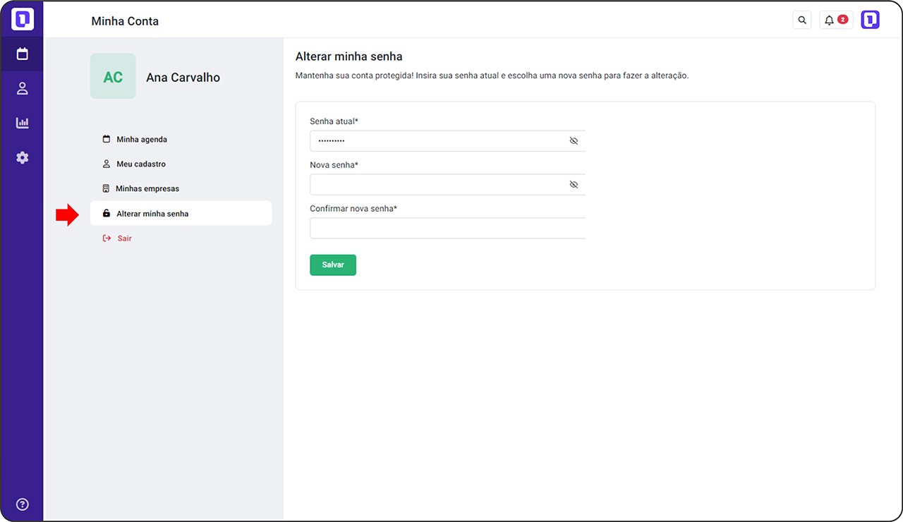 No menu lateral, escolha a opção ‘Alterar Minha Senha’. Em seguida, insira a nova senha e clique em ‘Salvar’ para concluir a alteração.