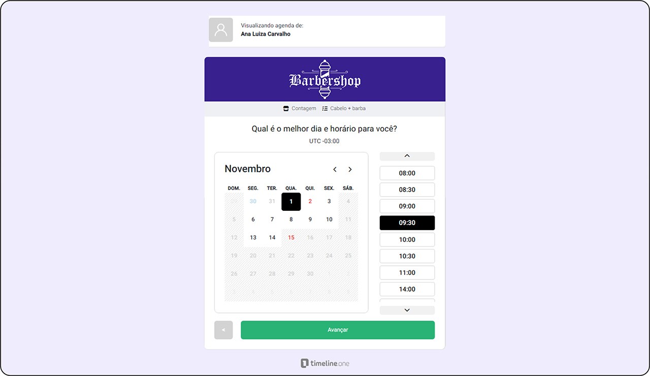 O cliente seleciona a data e hora disponíveis para o agendamento. Isso pode ser feito por meio de um calendário interativo.