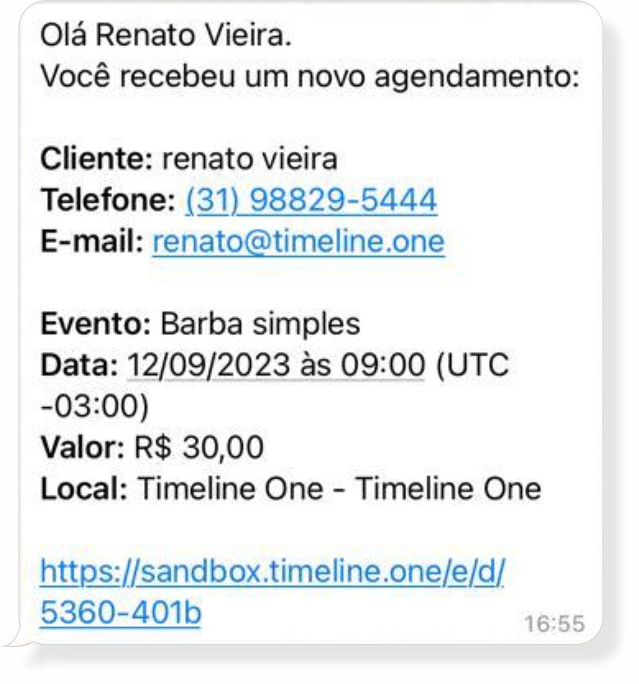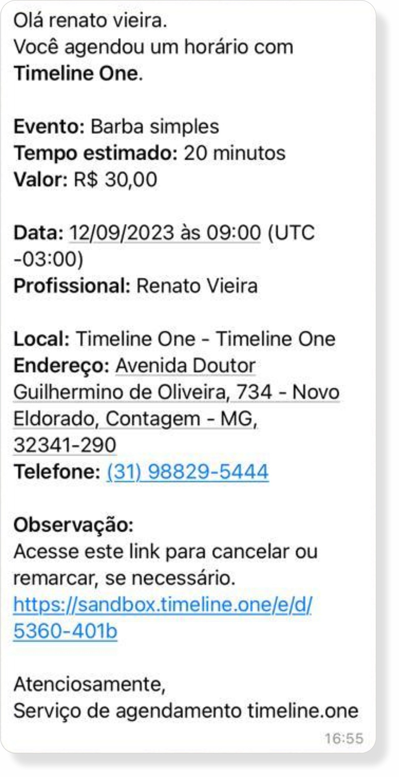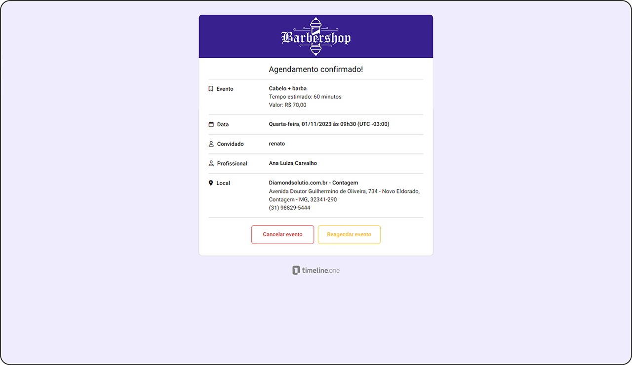 O cliente também recebe informações e podendo cancelar ou remarcar o agendamento, se necessário.