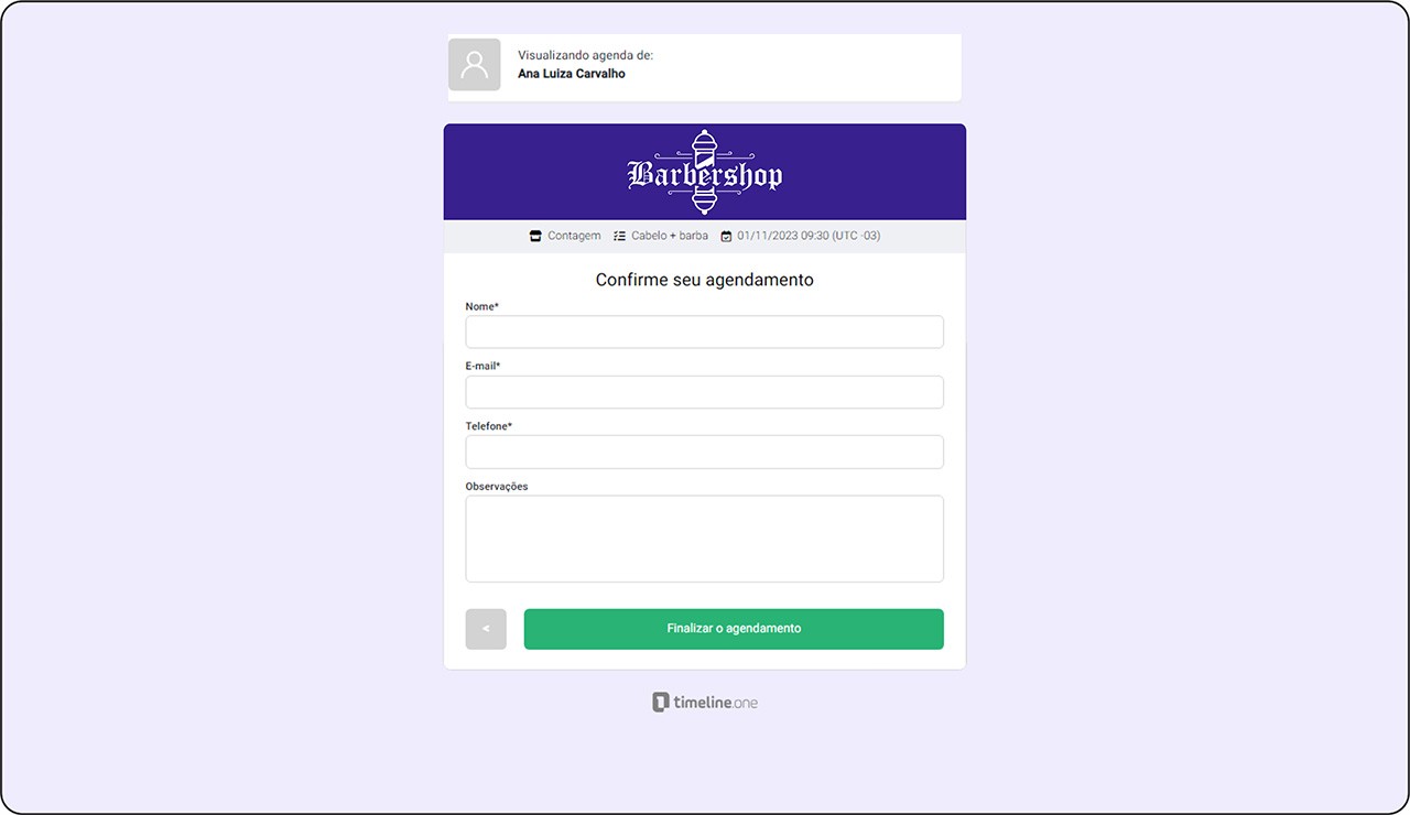 O cliente fornece suas informações pessoais, como nome, número de telefone, endereço de e-mail e finaliza o agendamento.
