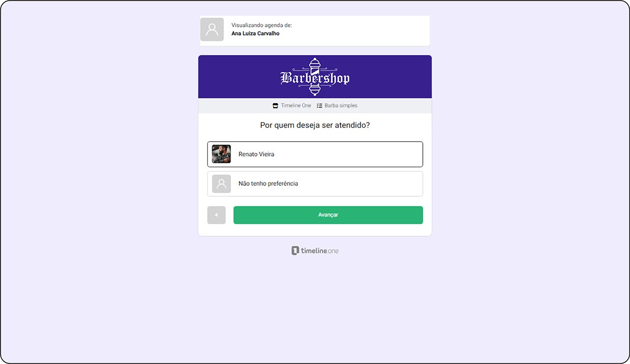 O cliente seleciona o profissional que deseja que o atenda. Isso pode incluir informações sobre a especialização ou disponibilidade dos profissionais.