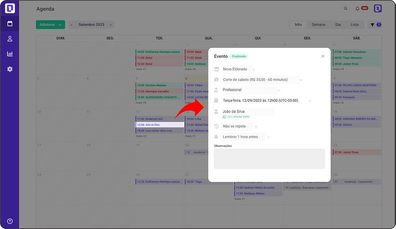 Passo 5 – Acesso Detalhado do Cliente: Clique no nome do cliente para acessar todas as informações relacionadas ao agendamento dele. Nossa plataforma coloca todas as informações necessárias ao alcance dos seus dedos.