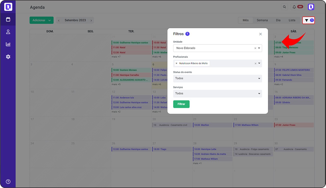 Passo 4 – Filtros para Organização: Use nossos filtros para organizar seus agendamentos, filtrando por unidade, profissionais, status do evento e serviços, facilita suas buscas de forma precisa em apenas alguns cliques.