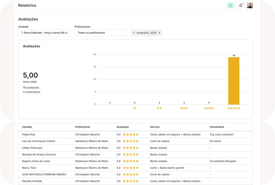 Acompanhe seus resultados com relatórios financeiros, operacionais e de desempenho. Identifique os melhores dias, serviços mais vendidos, faturamento, ticket médio e até a satisfação dos seus clientes.