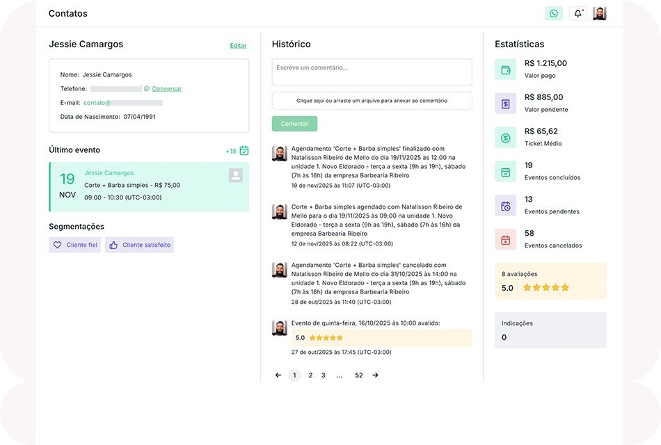 Tenha uma visão completa de todas as pessoas que já agendaram com você. O Timefox salva o histórico completo de cada cliente, incluindo atendimentos realizados, avaliações, preferências e mensagens enviadas.