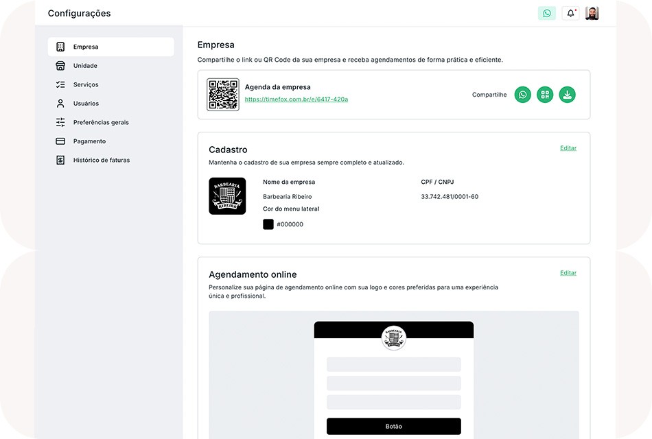 Toda a parte de configurações é extremamente simples e intuitiva. Você personaliza tudo: serviços, horários, profissionais, unidades, formas de atendimento e muito mais.